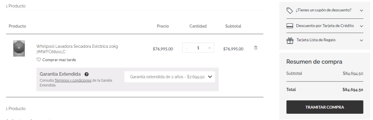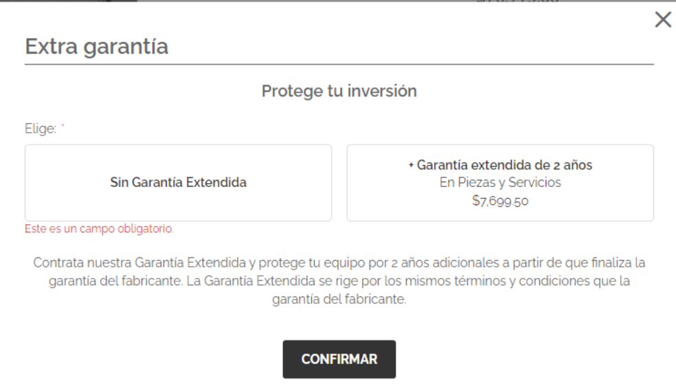 NOTA: La garantía extendida debe ser solicitada antes de completar el pago, de lo contrario, no se podrá solicitar posterior a la compra. Esto aplica tanto en Web como en tienda física.